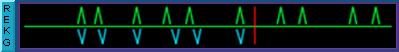 Rhythm EKG is a simple map that allows anyone to follow the basic beat of any piece of music. The correct beat is displayed by a series of "spikes" which point upwards. A red line representing time moves across these spikes, signaling the player to strum when the line and spike "line up". In real time, Virtual Music technology translates the signal into the right note if the timing is right or a flat note if the player is off. The REKG allows someone who has never played an instrument to easily understand the essential rhythm patterns. It also gives the player immediate feedback on his/her performance, allowing them to adjust and learn the correct way to play along and advance in the game.